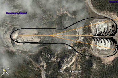I wrote back having looked on the web for evidence, but he would not reveal any more than what is said above. So here is what I found out and replied with. Thanks for your tip on the Mount Rushmore monument, I have been trawling the internet for references and pictures and I have to say that nothing is obviously Masonic about its shape, just its history. There is maybe a set square shape to the rock formation on the very top but it's not compelling evidence. Also the visitor centre is a curious shape. I have tried to show a possible connection in the shape of the Visitor Centre and the mountain. Click it for a bigger image. I can only assume that it is the three bar cross shape of it that you refer to as the significant Masonic reference? There may be a thirteen stepped pyramid at the end closest to the mountain as well, curiously without a point.