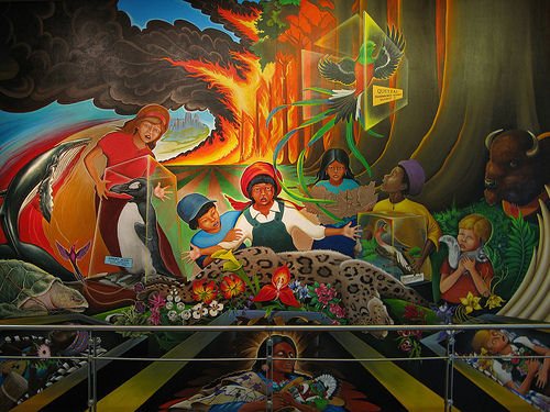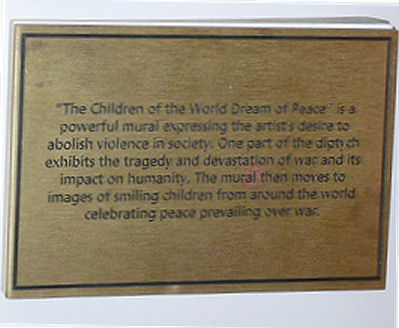 With regard to the freaky murals by artist Leo Tanguma (seen above), which I now believe are no longer on show and have been painted over recently(?), something strikes me about the order of them as described by bibliotecapleyades.net. 1) The Dead Women in Coffins Mural 2) The Dead Babies and General Skeletor Mural 3) Happy Happy Joy Joy 4) Jesus and the Holy Thingamabob This is out of order for the logical progression of the art; walls 2 and 3 are a diptych (a story in two parts), and this is confirmed by the actual plaque that was placed next to the murals 2 and 3: It says the mural then moves to images of smiling children, but this is surely referring to the first image as the two fit together as follows: |
