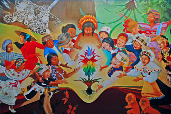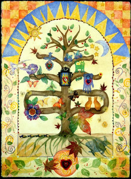 To address the claims of the plants in the first piece being psychedelic in nature, I would have to add that I think I recognize some of them; Datura Innoxia, Lophora Williamsii, Brunfelsia, and the central plant appears to be something like Coleus Blumei or Salvia Divinorum. These plants plus the native costumes seem to give the artwork a middle to southern American feel. As an alternative to the idea of the central plant being psychedelic, I also think it might be a tree of life analogue, such as the following strangely similar image, and possibly there is the image of a dove being created in the image near the top of the plant. |