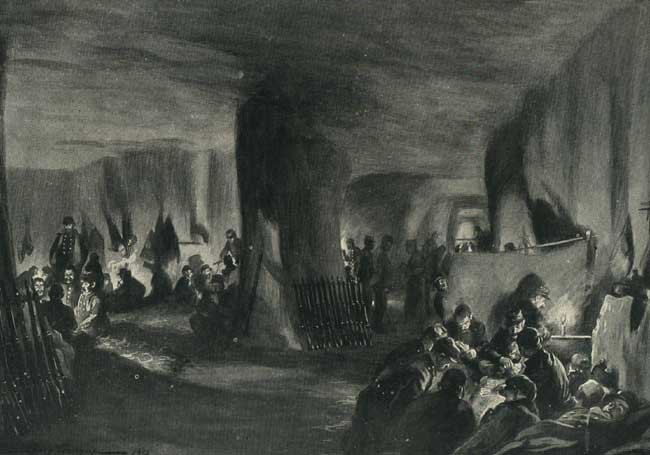 The thing that I found weird was how sterile the whole place was, there was nothing in the way of a creepy feeling which I expected to get. It was hard to imagine anyone living in the caves, I think that if there had been more personal artefacts around, or more signs of inhabitence, it would have been a lot more creepy. The only worrying part of the experience was the fact that wild boars now lived in the caves, and the evidence for them was everywhere. I found an artists impression of how life would have been in the caves at the time of there occupation. Life in the caves must have been hard, and the conditions, unsanitary, there would have been a huge problem with disease, and the caves were so large and cold that the soldiers must have had to keep fires buring night and day. |