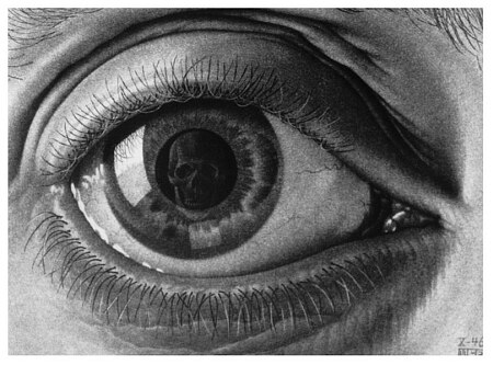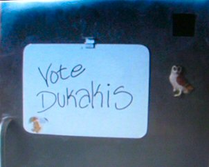 Frank also has a problem with his eye. Donnie killed him by shooting him in the eye, thus the resultant manipulated dead frank has a bloody hole for an eye and the rabbit mask's corrisponding eye shows things to Donnie. This I believe represents the masonic and egyption all seeing eye. Moving away from Frank, there is a point in the film where Donnies teacher is sacked and she leaves a message on the blackboard for Donnie; CellarDoor. She explains to Donnie that it is the most beautiful phrase in the English language. This is so random that it has to mean something more... A quick dig on the internet reveals that it was JRR Tolkien who said it, and he said that it was the most beautiful phrase when dissociated from its sense and from its spelling. Its meaning in the film may come from a french interpretation of the sound of the words "ciel a dieu". This means in English; sky with god and may be a reference to a masonic painting by William Blake. It depicts god measuring the world from a sky bound position with a compass. The painting is actually called "The Ancient of Days" but the deptiction is exactly sky with god. Other Maonic references in the film: Donnie's bookshelf is in the shape of an upside down triangle, that's a strange shape for a bookshelf! not quite of pentagram status but pyramidal at least. There is also a big picure of a wide open eye on Donnie's bedroom wall with a skull in it. This is a drawing of MC Escher's and represents the all seeing eye, maybe with intent. The viewer doesn't see the skull in the middle until later in the film. There is a carved wooden owl on his bedside table, owls are one of the most prevelent of Masonic symbols. There's also an owl on the firdge next to a sign that say vote Dukakis. Dukakis's rival in the 1988 US presidential elections was George Bush senior, who was reportedly a Freemason.