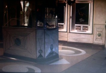 When the boys are shooting bottles in a field and talking about Smurfs, there is a Pepsi bottle shown in the frame and a chequered flag. The chequered flag seems to represent the floor of a masonic lodge, and Pepsi Cola's boss; C.D. Bradham was reported to be a supporter of the new world order. When Gretchen and Donnie go to the movies to see the Evil Dead, the movie theatre is adorned with pyramids wth spheres on top of them. This is the all seeing eye again. On the floor is a big face of an owl. In Donnies drawing of Frank at the Mirror; which is hung over his calendar near the end of the film, Frank is Scratching at the mirror and there is a chequered shower curtain behind him. Curiously the ears of the rabbit mask are floppy in this drawing and the eye sockets are empty, maybe signifiying a loss of power.