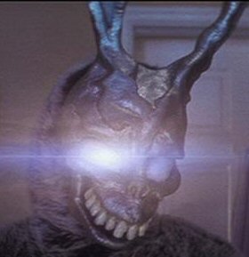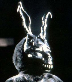 Rabbits it seems could be Masonic symbols, if they are, something has struck me that seems very fitting. If you look at an American Dollar bill, the part with the great seal on it, the edges of the scroll look like rabbit heads. They also remind me of a very particular rabbit. The film Donnie Darko features a very weird looking fancy dress costume that one of the characters wears. The head of this rabbit has always bothered me, not because it is freakish, but because its purposely shaped. The ears are such a peculiar shape and look like they are trying to reflect something, but I never new what. The skull of the mask is also shaped like a contorted human skull, and not a rabbit skull at all. Like the meaning behind the film, I had not been able to figure out what this meant. The film is full of symbology that didn't fit with anything I knew about. I couldn't see what it all meant, it wasn't religious, scientific, spiritual, it just seemed to be things with meanings that I couldn't explain. That was until I read up on the Freemasons, suddenly the film had meaning, lots of it! A rabbit I read represents Satan to the Masons, and Frank the rabbit certainly is the cause, the realisation, and the end of the "Tangent" universe in the film (Interesting use of the name tangent rather than alternate, or parrallel). The rabbit mask that Frank wears bears a striking resemblence to the scroll ends on the great American seal, those particularly shaped scroll ends are just part of many Masonic symbols on the seal.